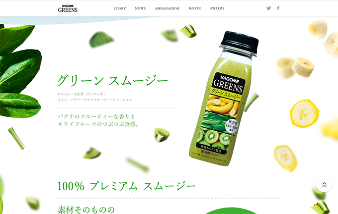 動き自体は控えめで、邪魔にならないながらも印象に残り、商品の100%スムージーを表現する優れたスクロールアニメーションです。